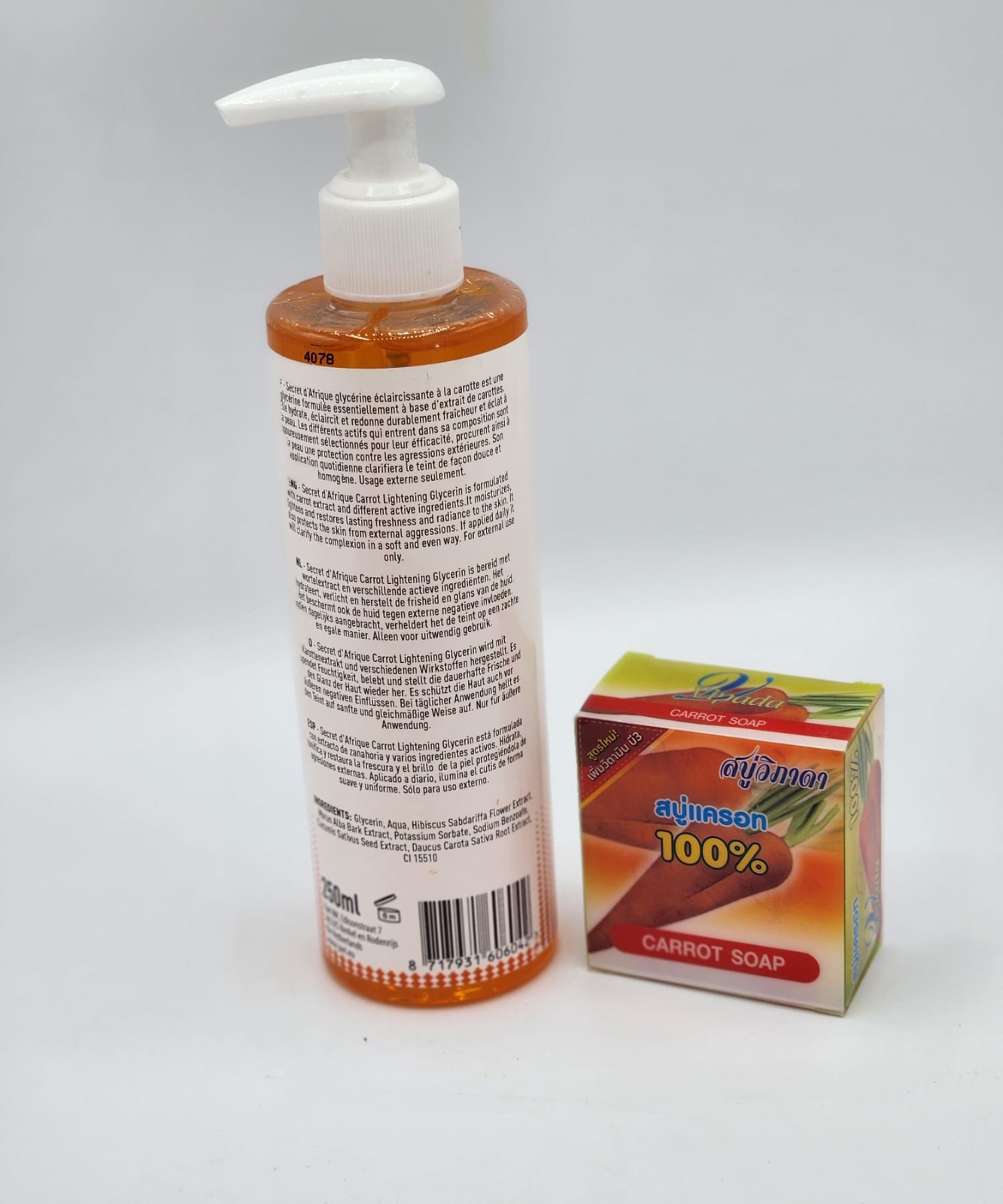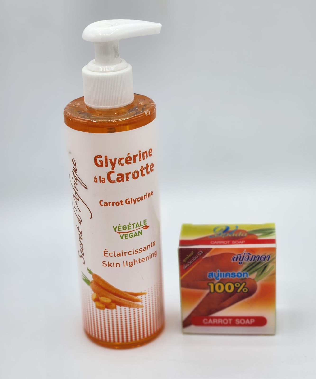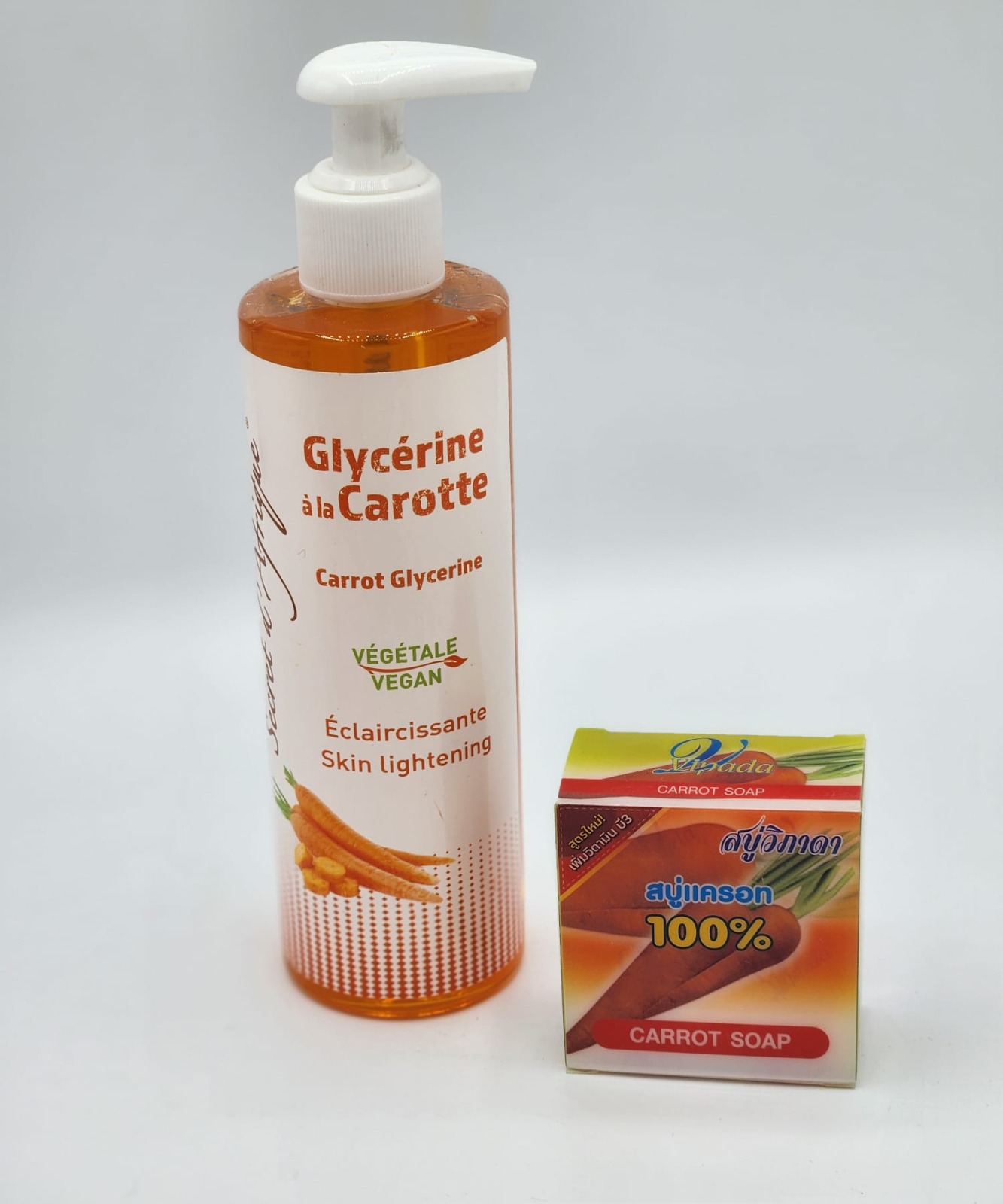 Le best duo carotte réunit deux soins complémentaires conçus pour offrir une solution complète contre les imperfections et les taches pigmentaires : une glycérine éclaircissante à la carotte et un savon Vipada ultra doux, tous deux enrichis en extrait de carotte bio riche en bêta-carotène, aloe vera apaisant, vitamine E naturelle et glycérine végétale purifiée. Ensemble, ils forment une synergie puissante qui nettoie, hydrate et unifie le teint—le tout sans hydroquinone ni ingrédients agressifs. En outre, ce duo convient à tous les types de peau, y compris les plus sensibles, et délivre des résultats visibles en seulement 2 à 3 semaines.