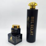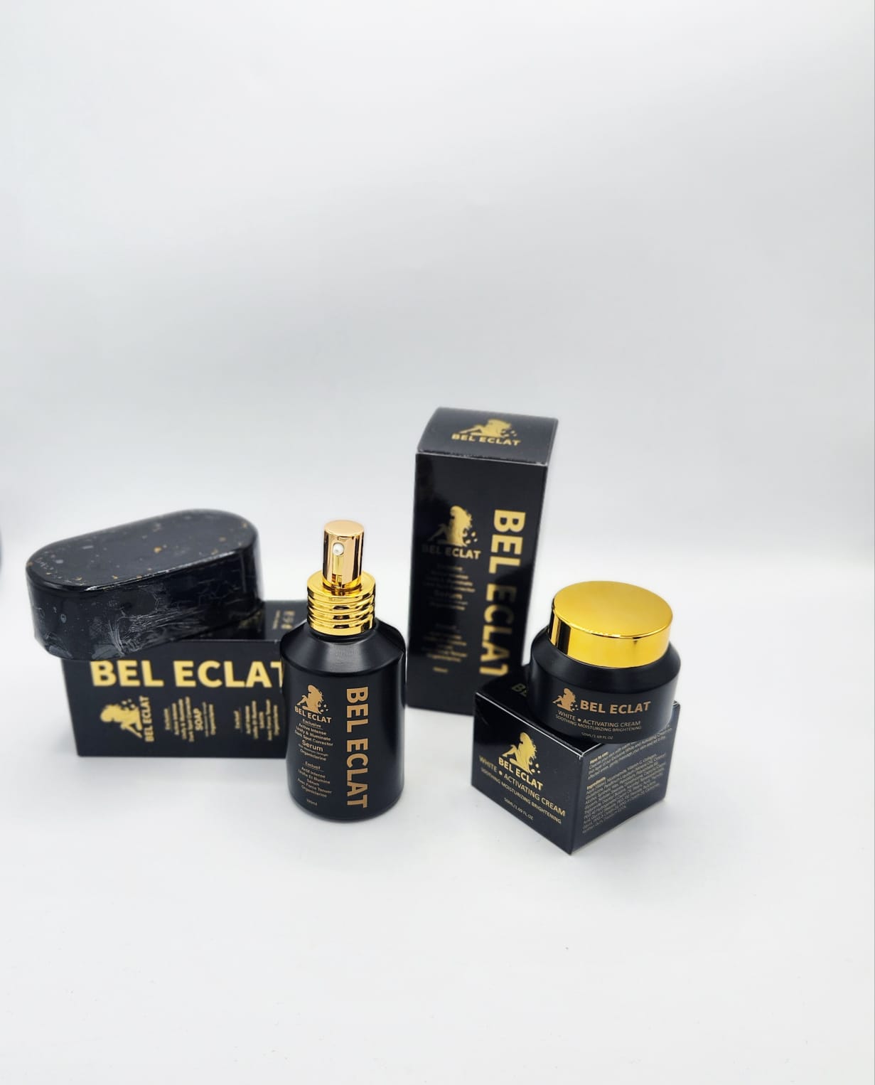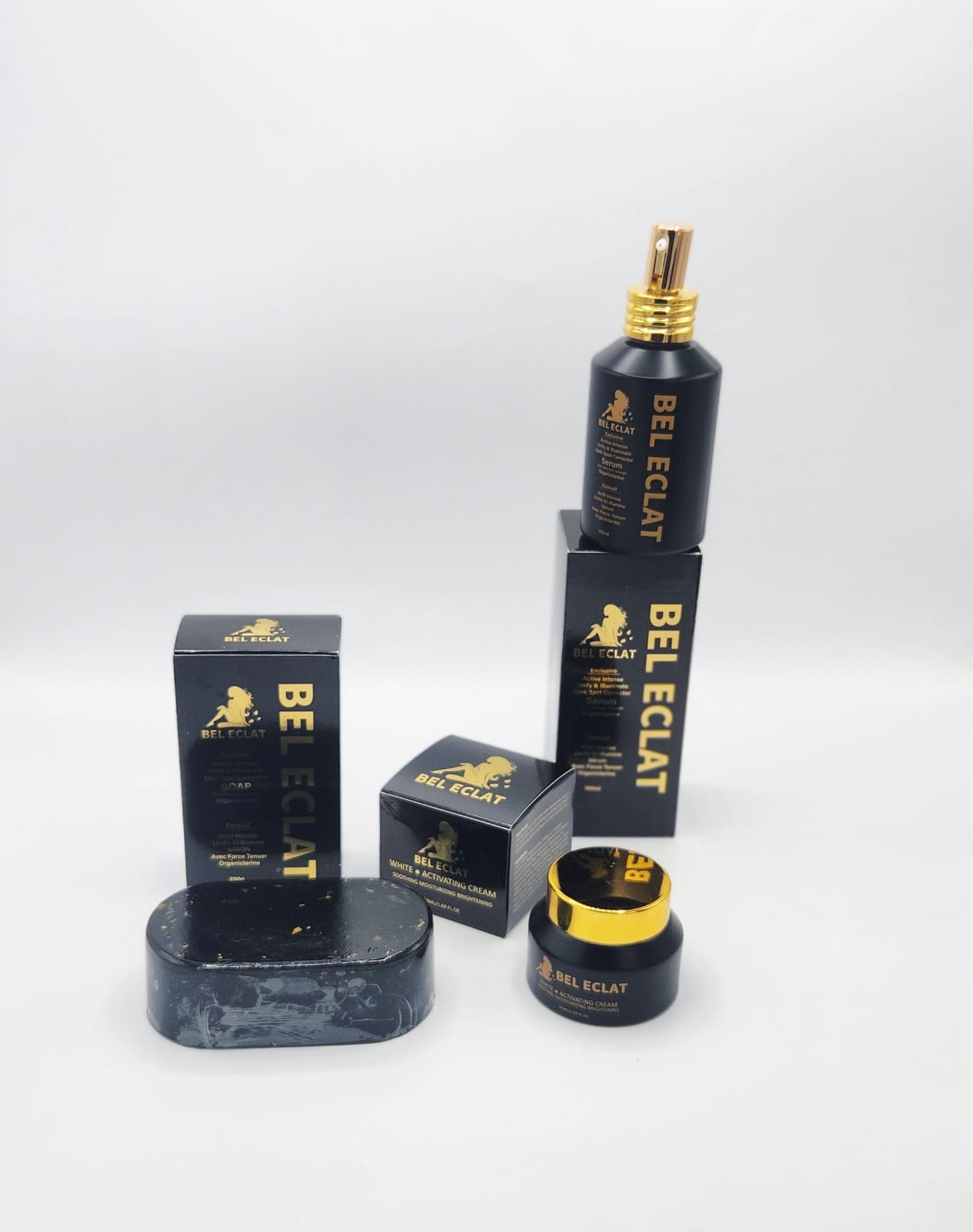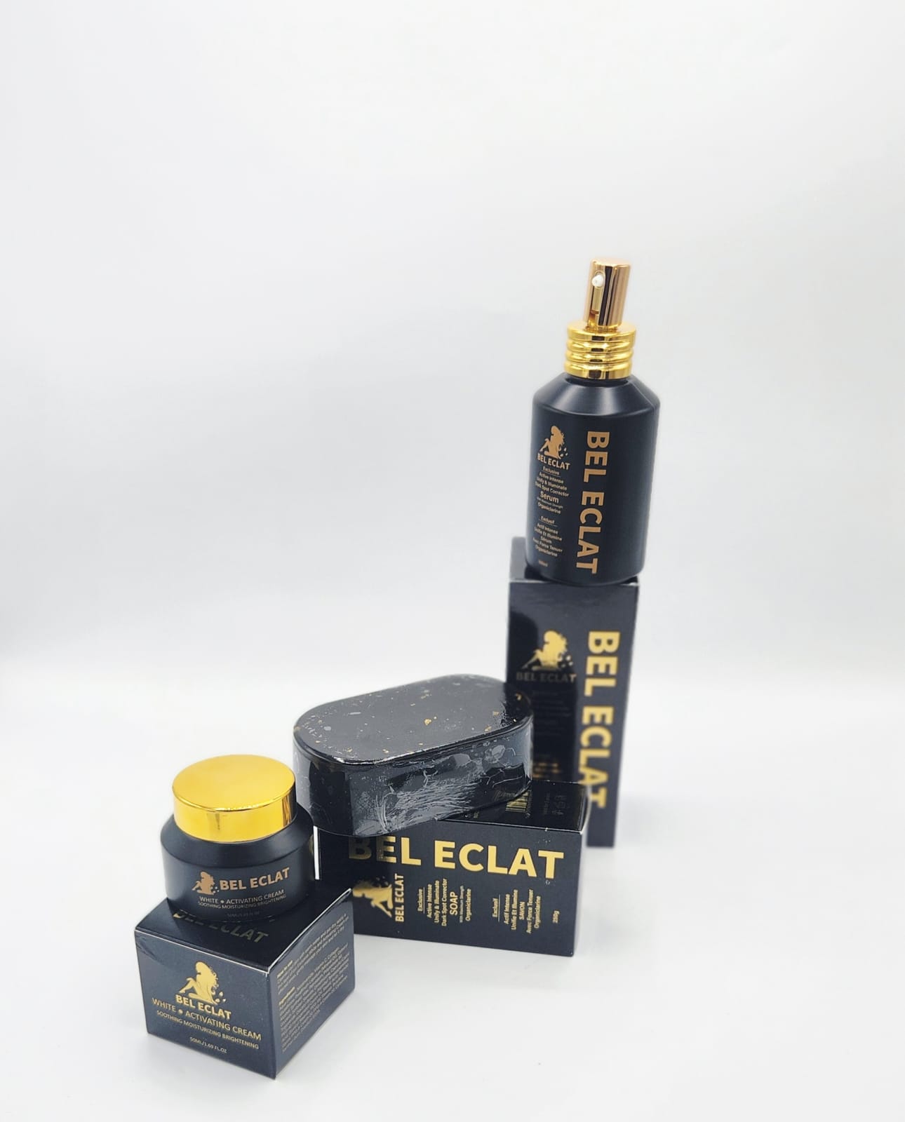 Le Savon Bel Éclat nettoie en douceur tout en éliminant les impuretés et l’excès de sébum, préparant ainsi la peau à recevoir les actifs éclaircissants. Le Sérum Bel Éclat, concentré en ingrédients puissants comme le glutathion et la vitamine C, cible directement les zones d’hyperpigmentation. Enfin, la Crème Visage Bel Éclat nourrit et protège la peau tout en prolongeant les effets éclaircissants et unifiants.